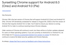 Google Chrome 浏览器是全球目前使用率最高的浏览器,现在,Google宣布将终止对两个旧版 Android 系统上 Chrome 浏览器的支持。其在一篇简短的博客文章中宣布,将停止对 Android 8 Oreo 和 Andro...