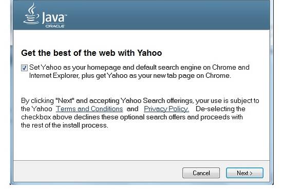 周三在雅虎公司的年度股东大会上,首席执行官玛丽莎•梅耶尔宣布与甲骨文达成合作伙伴关系,旨在让更多的用户来尝试雅虎搜索。从这个月开始,安装或更新甲骨文Java软件的用户将被提示,浏览器默认搜索引擎和主页是否设置成雅虎。玛丽莎•梅耶尔预计,该交易会让雅虎获得数百万新用户。