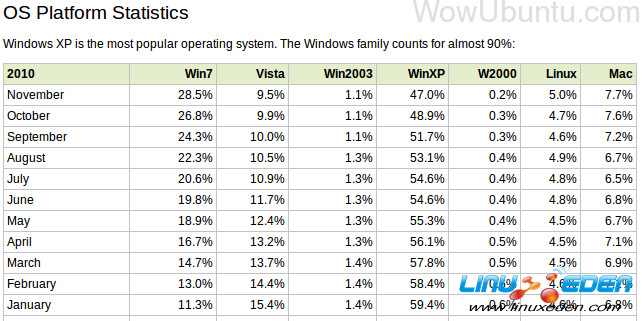 根据著名的 Web 开发门户网站 W3schools 的一份系统平台统计报告 (OS Platform Statistics ),2010 年 11 月份 Linux 系统的市场占有率已突破 5% 关口,比上月增长了 0.3% 。另外, WinXP 依旧是使用最多的操作系统,而整个 Windows 家庭占据了 90% 的市场份额。