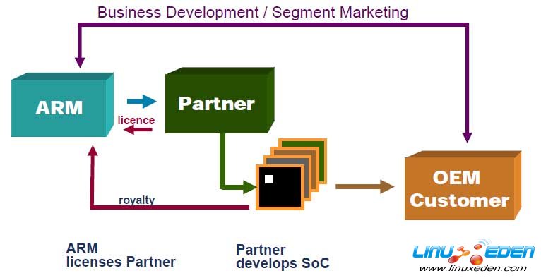 公司成立后,业务一度很不景气,工程师们人心惶惶,担心将要失业。由于缺乏资金,ARM做出了一个意义深远的决定:自己不制造芯片,只将芯片的设计 方案授权(licensing)给其他公司,由它们来生产。正是这个模式,最终使得ARM芯片遍地开花,将封闭设计的Intel公司置于"人民战争"的汪 洋大海。