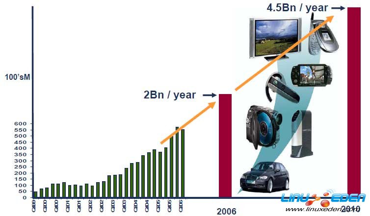 20世纪90年代,ARM公司的业绩平平,处理器的出货量徘徊不前。但是进入21世纪之后,由于手机的快速发展,出货量呈现爆炸式增长,ARM处理器占领了全球手机市场。2006年,全球ARM芯片出货量为20亿片,2010年预计将达到45亿片。