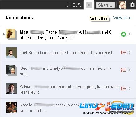 Google+的通知面板非常好用,因为它已深灰色区分该通知是否被阅读,就像谷歌网站一样(例如Gmail和谷歌Reader),如果浅灰色条变成红色的话,就表示用户收到一个新通知。