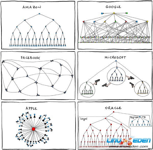 关注行业行情,我觉得作为一个DBA,我们不能太“书呆子”,我们还是要了解一下行业八卦,这在和行业内的朋友交谈交流的时候,很有好处。说oracle有着非常强大法务部门(相信不少人看到过下面这幅漫画,《从组织结构图看Google、Facebook、微软等大公司的企业文化》)。一天,拉里开着他的跑车回公司,一路飚车,被路边的警察看到超速了,追了上去,拉里一路飙回自己的公司,把车钥匙往法务部门老大的桌子上一放:You deal with it!