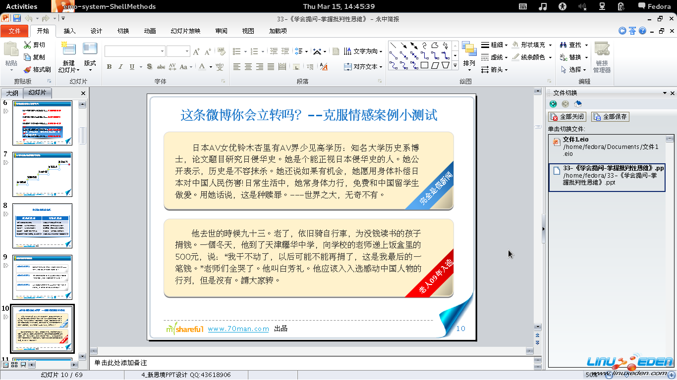 虽然是使用 Java 编写的软件,但是速度上还是比 LibreOffice 爽快。格式兼容度也比 LibreOffice 更好,比如上图所示的演示文档。