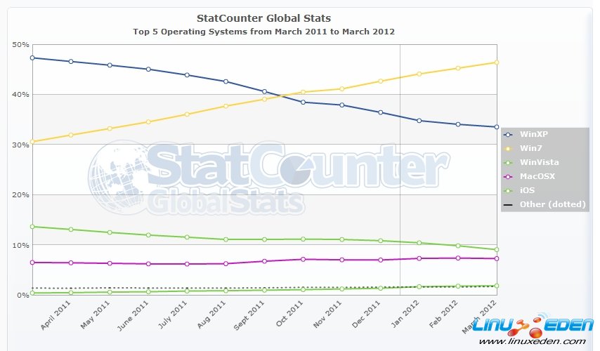 据statcounter.com最新数据显示,全球范围内win7的市场份额在受到中国市场的拖累下继续增加1.17个百分点达到 46.4%,xp和vista则分别下滑0.5和0.78个百分点,可以看出win7的增长基本来自两位前辈的用户,MacOSX则保持平稳。