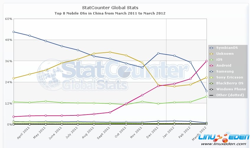 接下来便是中国市场,跟国际市场的反差巨大,Symbian出现大幅度下跌,35.28%下降到18.96%,从第一名滑到了第三名。Android和 iOS增幅都很明显,Android从25.89%上升到36.01%,iOS从12.79%上升到15.86%,国际市场上他们的表现跟国内市场看来是 密不可分的。有趣的中国的山寨操作系统Unknown增幅也很快,仅次于Android位居第二。