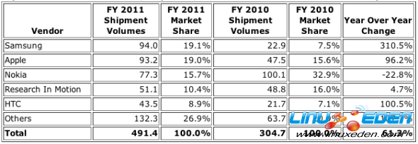 根据市场调查机构IDC发布的数据,2011年第四季度全球智能手机出货量同比增长54.7%。达到1.578亿部,超过了IDC预期的40%的增 幅,也超过第三季度49.2%的增幅。而2011年智能手机全年市场份额,Android手机所占48.8%,出货量约为2.378亿部,苹果iOS系统 2011年所占份额为19.1%,iPhone出货量为9310万部,诺基亚的塞班系统手机去年的总销量为8010万部。虽然相比2010年增幅有所下 降,但IDC预计,在可预见的未来智能手机市场仍将保持两位数的增长。