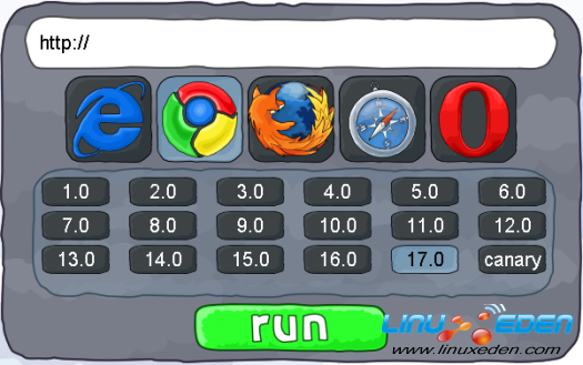 browserling可以模拟IE、Chrome、Firefox、Safri和Oprea等主流浏览器的版本。使用方法非常简单,先在上面输入要显示内容的URL,再选择浏览器的版本,最后按run即可。Firefox方面支援3.0、3.5、3.6、4.0、5.0、6.0、7.0、9.0和nightly的版本。Chrome可选择1.0版本到16.0和canary。Safari可支援4.0、5.0.5和5.1。Opera支援10.0、10.5、11.0、11.5、11.6。IE就只有9.0版是免费的,6.0、7.0、8.0都是付费的,这正是企业的获利模式。另外一个可藉付款而解除的限制,是每次连续显示网站的时间只有3分钟,付款版本每月20美元。付费与否就要看它是否能在三分钟之内,完全载入阁下的网站了。