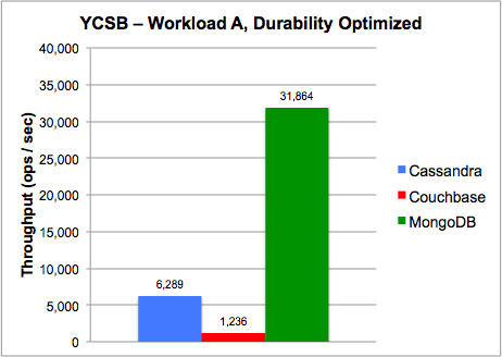 MongoDB 使用了三个不同的配置进行测试,从而了解三个产品从耐用性到最大的性能之间的差别。这三种测试场景包括:最大性能、确保无数据丢失的最大性能 和 最小数据丢失可能下的最大性能。