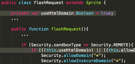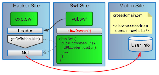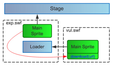 // vul.swfpublic class Vul extends Sprite { public var urlLoader:URLLoader = new URLLoader(); public function download(url:String) : void { urlLoader.load(new URLRequest(url)); ... } public function Vul() { Security.allowDomain('*'); ... } ...} |
