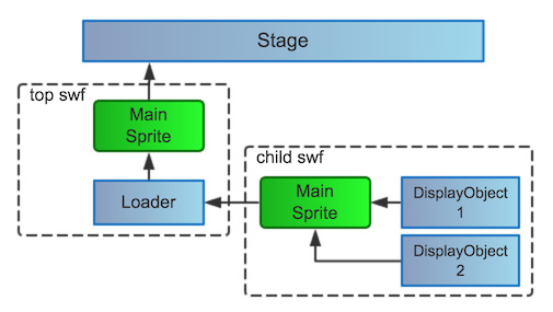 在 Flash 里,舞台(stage)是这个世界的根基。无论加载多少个 swf,舞台始终只有一个。任何元素(DisplayObject)必须添加到舞台、或其子容器下,才能展示和交互。