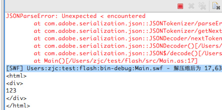 var s:String = '<html>\n<div>\n123\n</div>\n</html>';JSON.decode(s); |