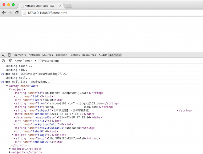 由于网易不少站点的 crossdomain.xml 都授权了 126.com,因此可暗中查看已登录用户的 163/126 邮件了: