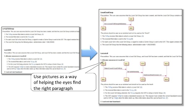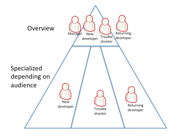 我在业余时间的一项调研让我洞察到对高效率和高质量最重要的三件事就是知识、知识还是知识。最好的知识获取途径就是通过对话,与了解这方面知识的人的对话。不幸的是,很多情况下这样的人并不在身边。 当文档是唯一的知识传承手段时,本文将尝试帮助读者编写有效而实用的文档。本文中所展示的实践都是基于我在一家大型跨国公司的项目中的工作经验。 这一切源于一个开发人员对我说他有一个改善项目文档的想法。我们就集合了一组对改善文档感兴趣的人并就一些规则达成了一致。 好的文档应该: 为了达成能够满足上述规则的目标,我们制定了六个实践: 尽管这听起来显而易见,但是很少有人真正这么做。在我们的项目中,我们的改进团队识别了四个目标群组。 当我们问起他们对文档的需求是,第一个目标群组用户相当惊喜。首先,之前从未有人问过他们。哇!其次,他们甚至从未使用过他们所拥有的大量文档。这一目标群组只需要三件事情的答案。总的来说,他们所需要的就是三行文档。其他的文档对于读者和编者都是浪费时间。我的天! 用户使用文档是为了找到他们的问题的答案。可以通过找到正确答案所需要的时间来衡量文档的质量。我们用Google Earth作为模型。 你是否曾试图在Google Earth上找到你的房子(通过下钻而不是搜索地址的方式)?它花费了你多长时间?大概30到60秒?在地球表面找到你的房子就像在1.5万亿(1.5*1012)个答案中找到其中一个答案一样。即使系统十分复杂庞大,找到答案的时间也不应该超过60秒。 如何将这一模型应用到文档上呢?我们遵循了类似于Google Earth移动层级的层次结构:月亮级、卫星级、航拍级和直升机级等。每一层级都有一个简短的介绍,我们称之为电梯间演讲,而且延续到下一层最多只有九种可能。 记住,并非所有的文档工具都适于下钻的方法。包含目录结构的Word文档可能就不是一个很好的主意。有指向下层链接的wiki就好很多。 我们讨论了文档化的原因并得出如下最小化文档规模的原则: 适量的文档就是在太短以致不实用和过长以致影响阅读之间找到平衡。如果你不使用它,也就不会去更新它,而如果文档过于陈旧并会产生误导,也就变的毫无价值甚至会造成损失。 这是我从Henrik Kniberg那里得来的一些忠告: 就这么简单:) 冗长、不切题的文档读起来让人厌烦。如何才能让文档更切题? 我们尝试过这种办法:我们请潜在的使用者与具有该知识的人进行面谈。读者比专家更知道他们想要什么以及应该如何组织文字。而专家只能猜想读者想要了解什么以及文字应该如何组织。 一个典型的反模式就是当员工要离开公司时,经理请他们在剩余的这段时间里将他们所知道的全部知识都写成文档。对大多数人来说这更像是一种惩罚而不是增值的工作。 尽管文档应该尽量简洁,不过当层次结构更加深入,在叶子层级的文档可能需要稍长一些并且应该包含更多细节。如何能够在不失去读者的前提下完成这项工作?不要把文档写的像一篇科学报告一样,要用科普杂志那种更容易理解的风格,包含足够多的可视化元素和简短易读的段落。 增加可视化元素能够帮助文档使用者快速找到他们所需要的知识。就像读报纸一样,图片会更吸引读者的眼球。 用图片帮助读者找到合适的段落 写好文档的最大挑战就是一直让文档处于最新状态。 这需要一些训练和一条简单的Boy Scout规则,“总是让营地比你发现它时更整洁。”在文档中这就意味着:如果文档没有提供给你所需要的信息——只要你一找到正确信息就尽快把它更新到文档中。 所做出的修改与相应的文档记录之间距离越远,保持文档更新的可能性就越低。代码中的注释距离修改更近,所以相对来说就比在另外一个工具中记录的文档更有可能被更新。如果用wiki记录文档,很容易就可以将代码中的注释集成到wiki中。 如果文档难以更新,或者不能在发现问题时及时更新,就很可能不会被更新。使用可以更容易更新或甚至可以同步更新的工具。图片也是一样,因此确保要使用一个可以在工具中直接创建和更新图片的工具。带有PlantUML扩展的MediaWiki和带有Gliffy插件的Confluence就是两个比较好的例子。 当在另一个城市工作的新团队需要修改之前由我们的部门维护的代码时,我们的文档接受了真正的测试考验。一个简短的介绍和一封包含指向文档区域的链接的电子邮件就是我们之间唯一的接触,而让我们相当惊奇的是这也是所需要的全部接触。我们成功达成了目标。我们有了可以快速方便地创建和维护的文档,而且这些文档也能够有效地帮助使用者找到他们所需要的答案。 希望我们的规则和实践能够帮助你创建更好的文档。 祝你好运! 免责声明:标题中的“精益”与汽车制造商丰田无关。我所指的是形容词精益(含义:高效、无浪费)。 感谢Ellen Gottesdiener的支持和帮助。感谢Jonas Boegård,Henrik Rasmussen和Igor Soloviev的好主意。同时感谢Mia Starck和Yassal Sundman在语言方面的帮助。 注:在第一段中所提及的“知识、知识还是知识”指的是:领域知识(了解业务)、系统知识(了解系统的领域和架构)和即时的产品需求知识(与我们目前正在创建的功能的相关知识)。本文中所描述的文档化方法最适于领域和系统知识,并且可以在这两者之间建立桥梁。 查看英文原文:Lean Documentation好文档