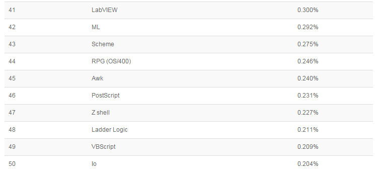 对比去年同期在TIOBE榜单占用较大涨幅的是 C++ (+1.89), C# (+1.52) 和 Visual Basic.NET (+1.70)。有趣的是 这三者都是Microsoft's Visual Studio的关键性语言。这难道是一个巧合吗?Visual Studio是经得住时间考验的少数商业编程IDE之一。它和Eclipse是工业化化编程中最常见的2个集成化开发环境。所以也难怪C++,C#.VB.NET 在不断的增长。