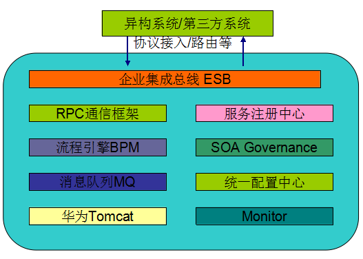 为了满足电信业务的需求,华为软件研发了SOA中间件,它的逻辑架构图如下: