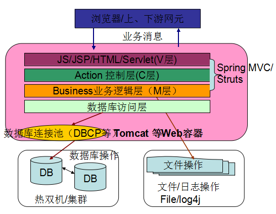 2005年-2008年间,华为电信软件大多数产品线都切换到Java语言进行新产品的设计和开发,当时随着Struts的MVC模式以及Spring对J2EE复杂企业应用对象生命周期的配置式管理的流行,华为电信软件绝大多数产品采用基于Spring + Struts + Tomcat模式进行开发,数据访问中间件主要采用iBatis和Hibernate,它的逻辑架构如下所示: