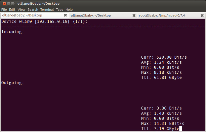 正如你在上面的截图中所看到的那样,由 nload 提供的图表是非常容易理解的。nload 提供了有用的信息,也展示了诸如被传输数据的总量和最小/最大网络速率等信息。