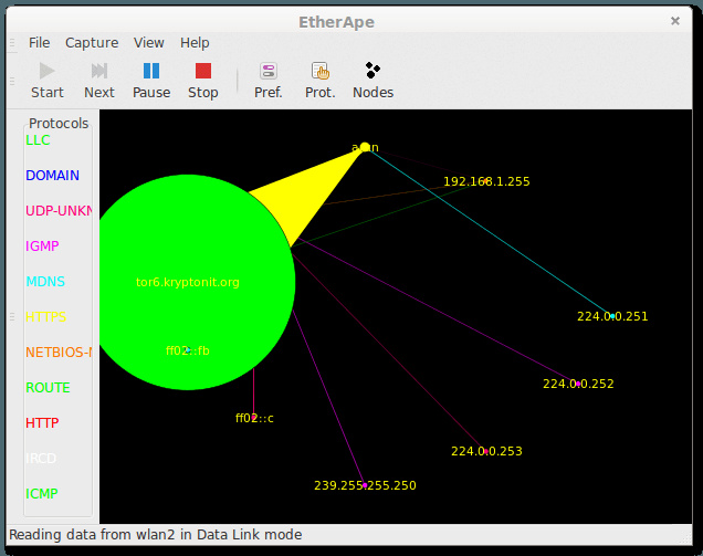然后, etherape 的 图形用户界面 便会被执行。接着,在菜单上面的 捕捉 选项下,我们可以选择 模式(IP,链路层,TCP) 和 接口。一切设定完毕后,我们需要点击 开始 按钮。接着我们便会看到类似下面截图的东西: