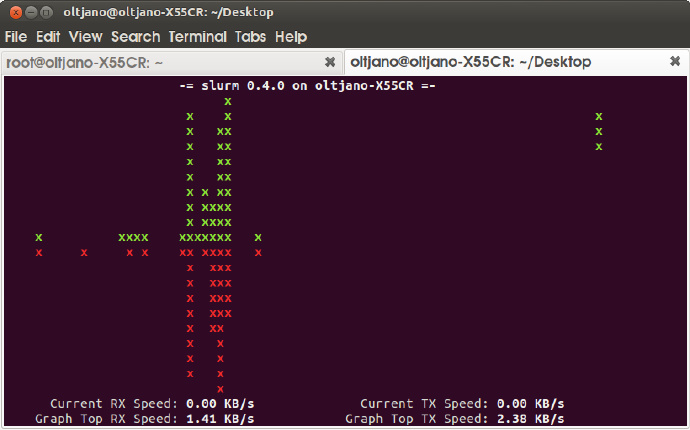 slurm 是另一个 Linux 网络负载监控工具,它以一个不错的 ASCII 图来显示结果,它还支持许多按键用以交互,例如 c 用来切换到经典模式, s 切换到分图模式, r 用来重绘屏幕, L 用来启用 TX/RX 灯(注:TX,发送流量;RX,接收流量) ,m 用来在经典分图模式和大图模式之间进行切换, q 退出 slurm。