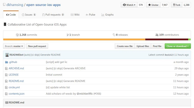由dkhamsing发起的Open-Source iOS Apps收集了各种开源的iOS App,并进行了详细的分类,比如游戏、社交、健康、键盘、定位、多媒体、新闻、办公、安全以及小工具类等。截至目前,项目已收集了502款开源iOS应用,收获了7967+个Star,并吸引了109位Contributor的参与。