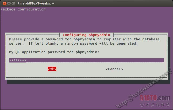下一个提示是为phpMyAdmin创建一个MySQL应用程序密码。如果你想要创建一个随机性密码,可以按回车键。我通常使用用于MySQL根密码的同一个密码。从安全性方面考虑,这么做可能不是最佳方法,但是由于这用于封闭的开发环境,所以风险可能很小。