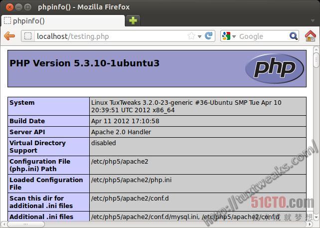 回到Web浏览器,输入地址http://localhost/testing.php/,你应该会看到一个网页显示关于所安装的php的信息。