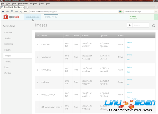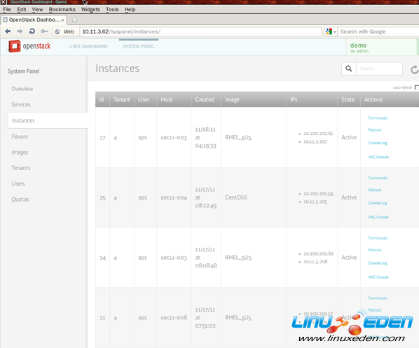 这张图显示的就是目前跑在私有云上的实例。我们可以看到右边有四个选项,Terminate是撤销,也就是删除虚拟机实例,Reboot重启,Console Log显示终端上的信息,VNC Console这个是直接在web上面开个vnc窗口显示console,另外还有Snapshot的按钮,这个按钮会出现在以用户自己身份登陆的界面上。目前我是以admin身份登陆。