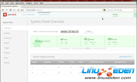 限于篇幅原因,还有很多tab页面我不做介绍了。总的来说,你只要给一个用户一个帐号,他就能从image选择不同配置(cpu,内存,磁盘)的实例,分配ip,开端口,登陆,完全自主的操作,不需要管理员去干涉。如果你觉得这套管理工具对你或者你们企业来说有一定的帮助,想要尝试一下,或者基于它来作二次开发(因为OpenStack是完全开源的),可以继续往下看,我将会简单介绍一下如何构造这么一个系统。
